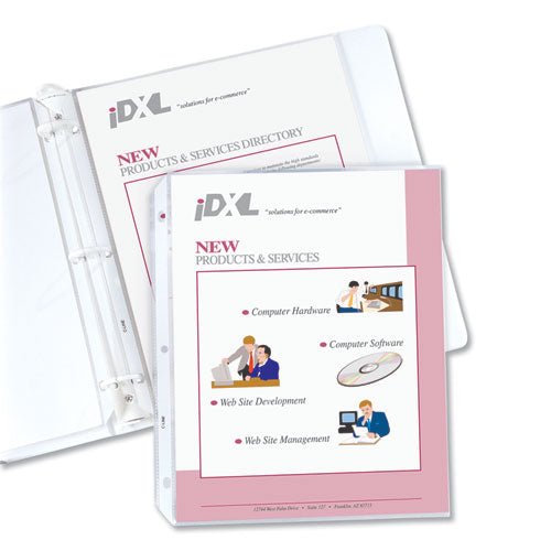 Sheet protectors are widely used as a tool to keep documents in their original condition. Once inserted into the holder, the documents instantly have a plastic, protective cover, which will help eliminate damage and tearing while they are being stored. This is especially important for high-use documents that are accessed on a regular basis. Document holders have strong, reinforced edges, which prevent tears. Top-loading sheet protectors are pre-punched to fit standard three-ring binders. This allows for documents to remain in their original state. The acid-free polypropylene material eliminates photocopy transfer. Sheet protectors are a durable storage option for important documents and reference materials. For 11" x 8 1/2" Inserts—Three-hole punched for unpunched sheets. Load Orientation: Top; Sheet Capacity: 2; Sheet Protector Type: Ring Binder; Insert Size: 8.5 x 11.