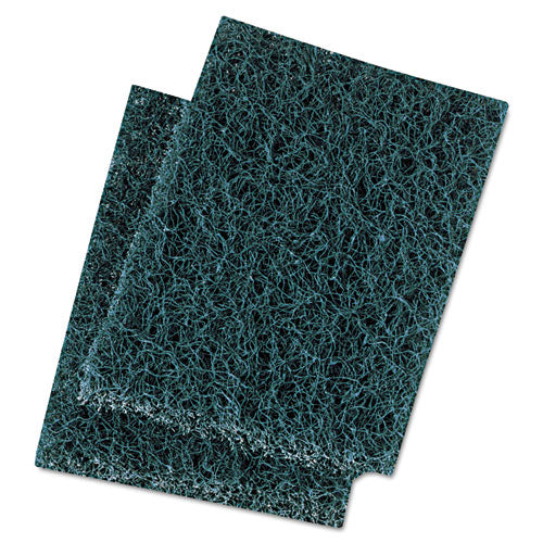 Scrubbing pad for extra heavy-duty cleaning of heavily encrusted pots, pans and kitchen equipment. Works well on grimy maintenance equipment. Makes an excellent alternative to stainless steel scrubbers. Scouring Pads/Sticks Type: Pad; Material(s): Resin; Fiber; Mineral; Size (W x L): 3.5" x 5"; Color(s): Dark Blue.