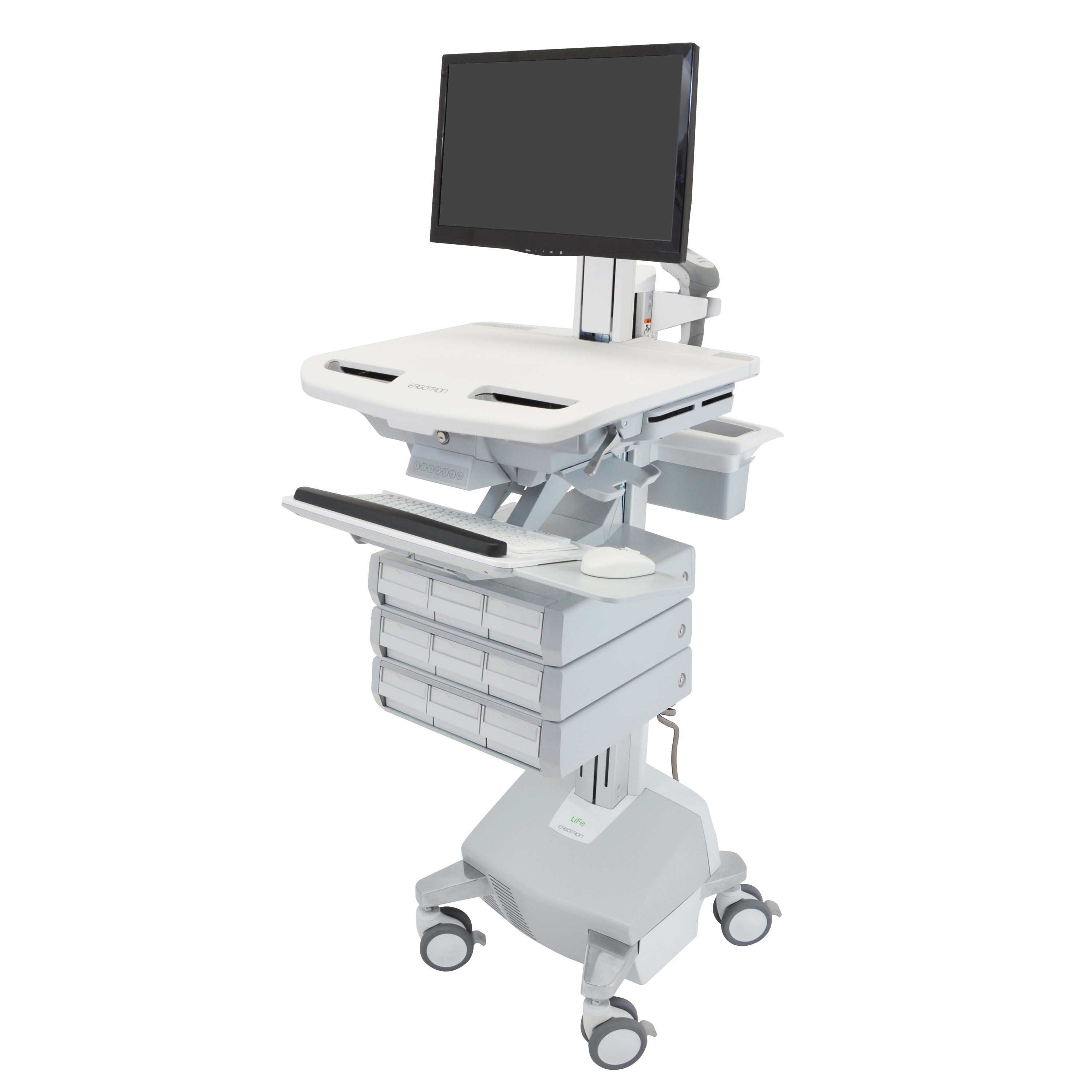 Stay productive and on the go with our LiFe power system. This innovative, truly ergonomic and easy-to-maneuver healthcare cart features sit-to-stand height adjustment, independent screen positioning and an adjustable back-tilt keyboard tray. Its auto-locking drawer system enables simple and efficient management of non-controlled medication with variable-length PIN access for users.