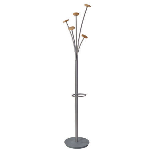 Features a contemporary look. Stylish and functional. Includes five coat knobs, an umbrella stand and a water retainer. Weighted base for perfect stability. Easy assembly, no tools required.
