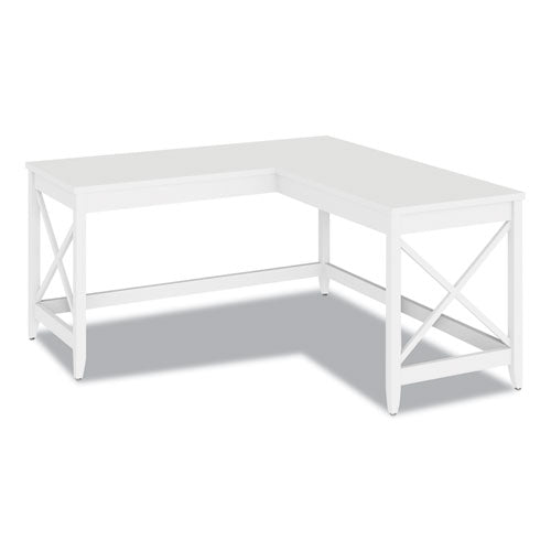 Stylish, L-shaped, farmhouse desk with X accents on side panels. The multi-function desk is constructed with a smooth, laminate wood top and white wood legs. The simple design without drawers fits conveniently into a corner to maximize space. Wide tabletop surfaces provide ample space to work and display organizational or decorative items. The open design has a light, airy feel, and coordinates with most décor. Some assembly is required.