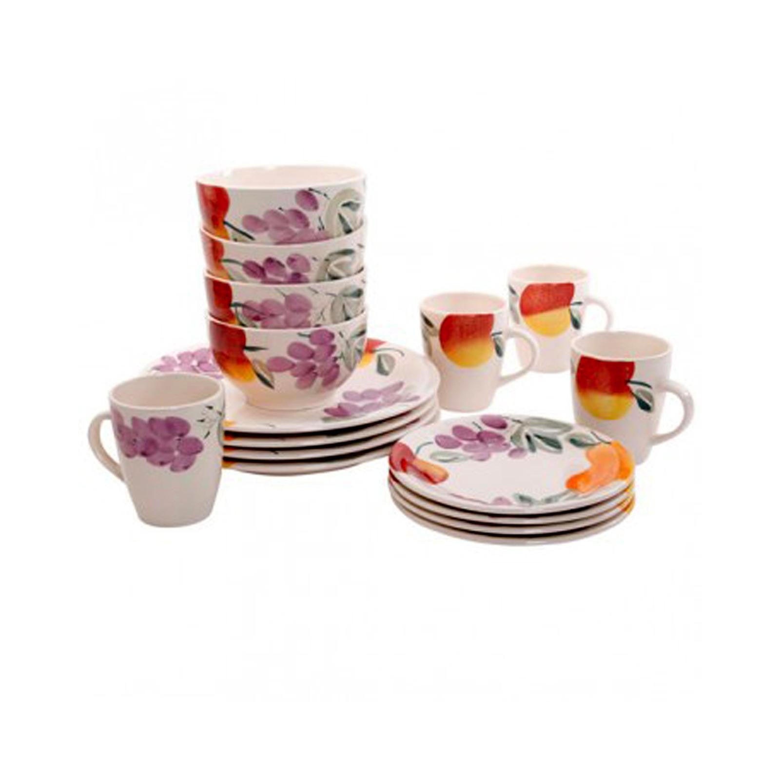 Fruit Garden 16 Piece Dinnerware SetThe Fruit Garden 16 Piece Dinnerware Set features a luxurious hand-painted fruit design. Use the set every day or just on special occasions. A setting for 4, this dinnerware set includes four dinner plates, four dessert plates, four bowls and four 12-oz mugs, which lets you set the stage for a beautiful family meal or a dinner party with friends.