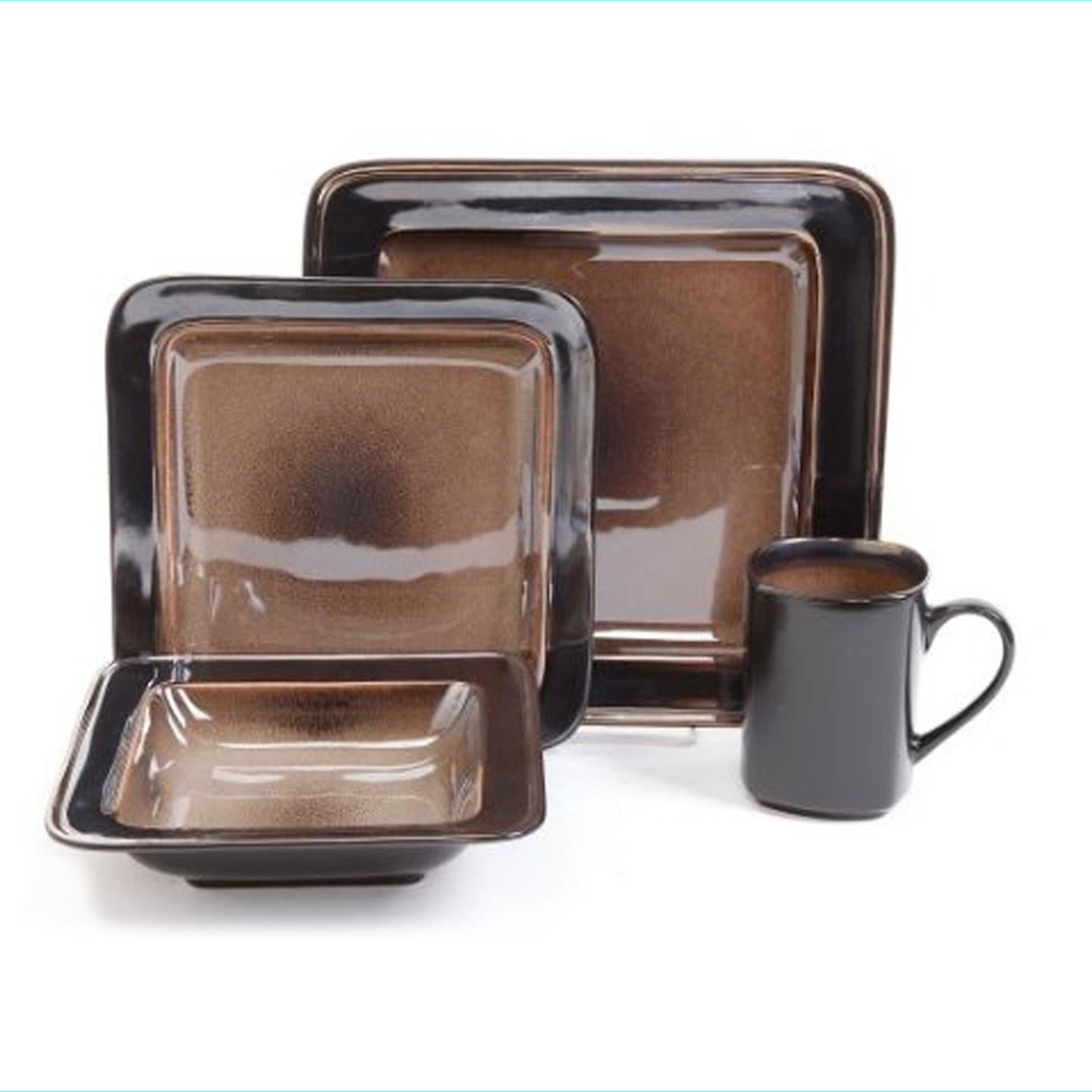 Gibson 16−pc. Astro Galleria Brown Dinnerware SetThis contemporary square Astro Galleria dinnerware set features a two-tone reactive glaze finish that ensures no two pieces are alike. Sixteen piece brown stoneware set by Gibson includes 4 dinner plates, 4 salad plates, 4 bowls & 4 mugs. Dinnerware set is dishwasher safe.