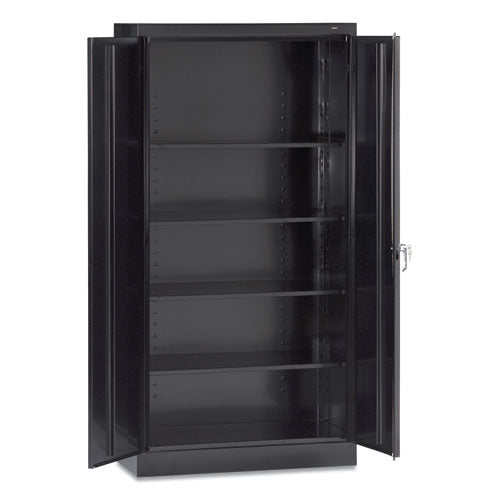 Built-in shelf support tabs—no more lost clips! Heavy-duty construction ensures extreme durability. Shelves adjust to accommodate different sized items. Keep contents secured with lock. 36w x 18d Cabinet (Assembled)—150 lb. weight capacity per shelf. Color: Black; Overall Width: 36; Overall Depth: 18; Overall Height: 72.