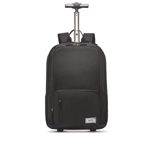 Bleecker Recycled Rolling Backpack with protective sleeve protects 15.6" laptops. Material made from recycled PET bottles. Antimicrobial coating helps prevent the growth of bacteria. Water resistant coated fabric. Transforms from backpack to roller with hideaway backpack straps. Protective sleeve fits laptops up to 15.6". Pack away wheel cover to keep your back clean. Interior compression straps for tighter packing. Hideway push-button telescoping handle. Easy glide rolling wheels.