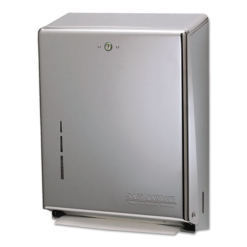 Versatile design allowd operators to choose which folded towel to use. This durable dispenser has a large capacity for reduced maintenance costs and a standard key lock to prevent towel theft. Towels Dispensers Type: Folded Towel Dispenser; Capacity (text): 500 Multifold; 300 C-Fold; Material(s): Steel; Color(s): Stainless Steel.