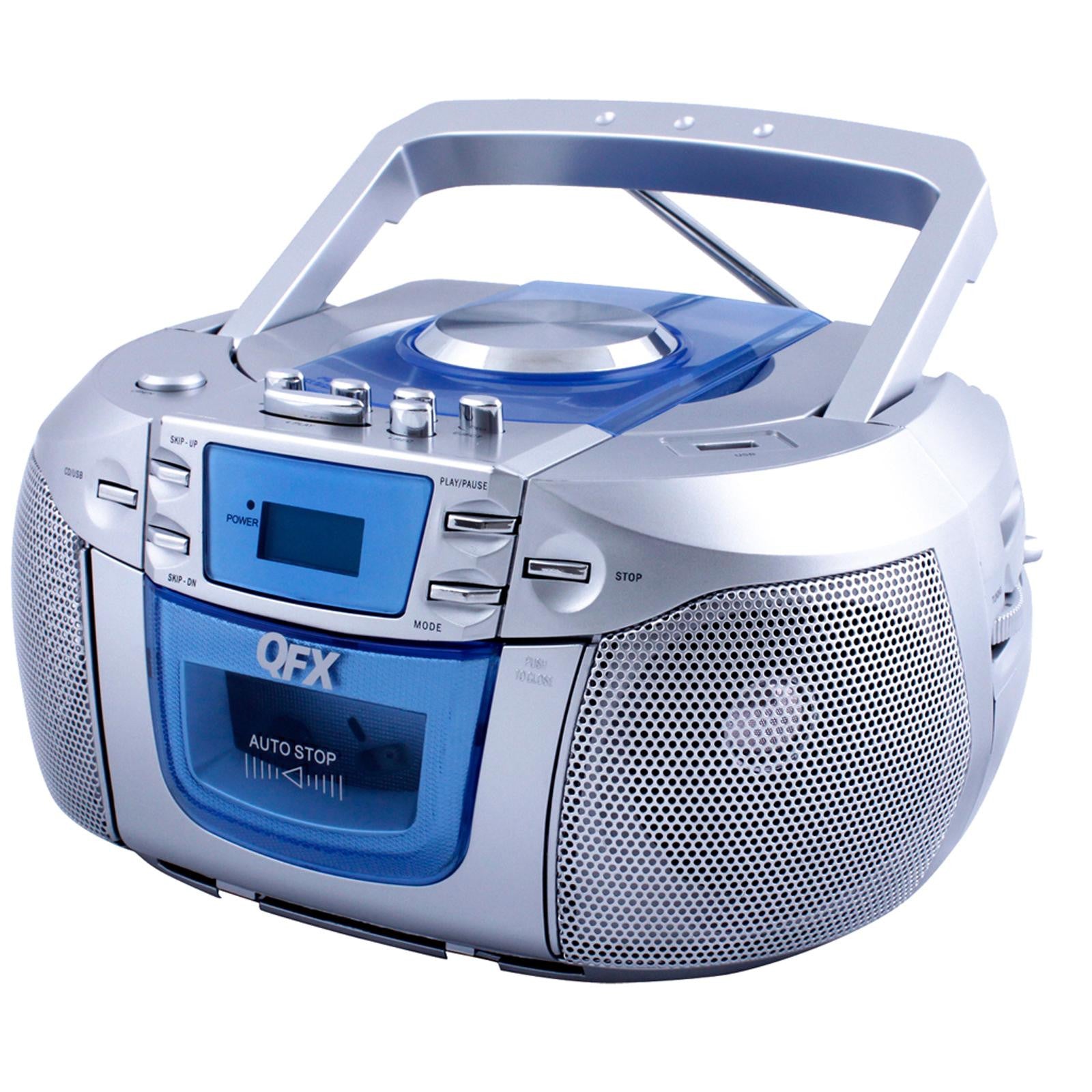 QFX Portable Radio with CD Player Cassette and USB Top Loading CD/MP3 Player-Silver with blue• Top Loading CD/MP3 Player