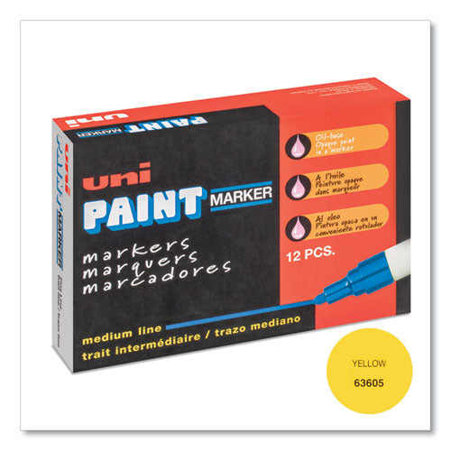 Create long-lasting artwork with uni Paint Markers. These permanent paint markers can be used on glass, metal, stone, plastic, wood, and other surfaces. The oil-based formula is glossy and opaque, and produces bold marks. Marker Ink Type: Permanent; Marker Tip Type: Bullet; Marker Tip Size (text): Medium; Marker Color(s): Yellow.