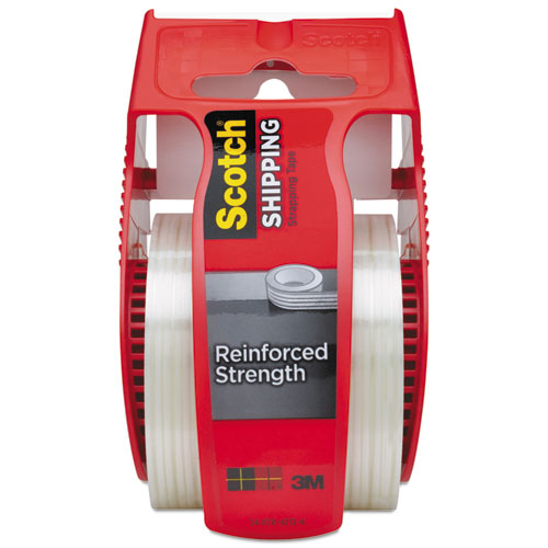 Provides very good holding power under a wide range of conditions. Scotch® Reinforced Strength Shipping and Strapping Tape combines a strong polypropylene backing reinforced with continuous glass yarn filaments and a synthetic rubber resin adhesive for long-term holding power to most fiberboard surfaces, including recycled and printed. The adhesive provides good initial adhesion and holds well with minimal rub-down. The tough, clear film backing is abrasion- and moisture-resistant. Features a 320 lbs. pulling strength rating. Grade: Heavy-Duty; Core Size: 1.5"; Dispenser Included: Yes; Adhesive Material: Hot Melt Synthetic Rubber.