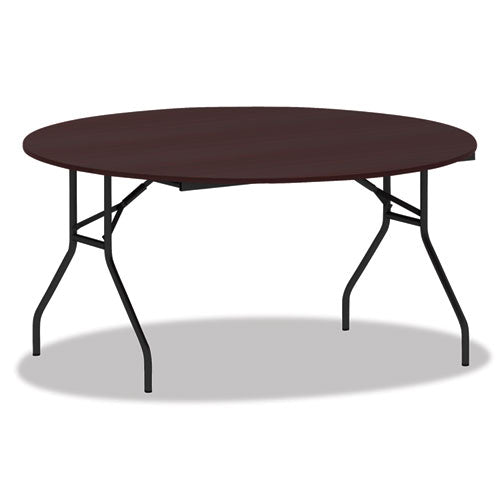 Scratch-resistant melamine top is 5/8" thick with a one-piece, steel apron and vinyl edging. Gravity leg-locking mechanism makes set-up quick and easy. Folds to 2 1/2" thick and locks for easy transport and storage. 1" diameter, steel legs have plastic foot caps to protect floors. Holds up to 1,200 lbs evenly distributed. Top Color: Mahogany; Color Family: Mahogany; Base Color: Black; Top Shape: Round.