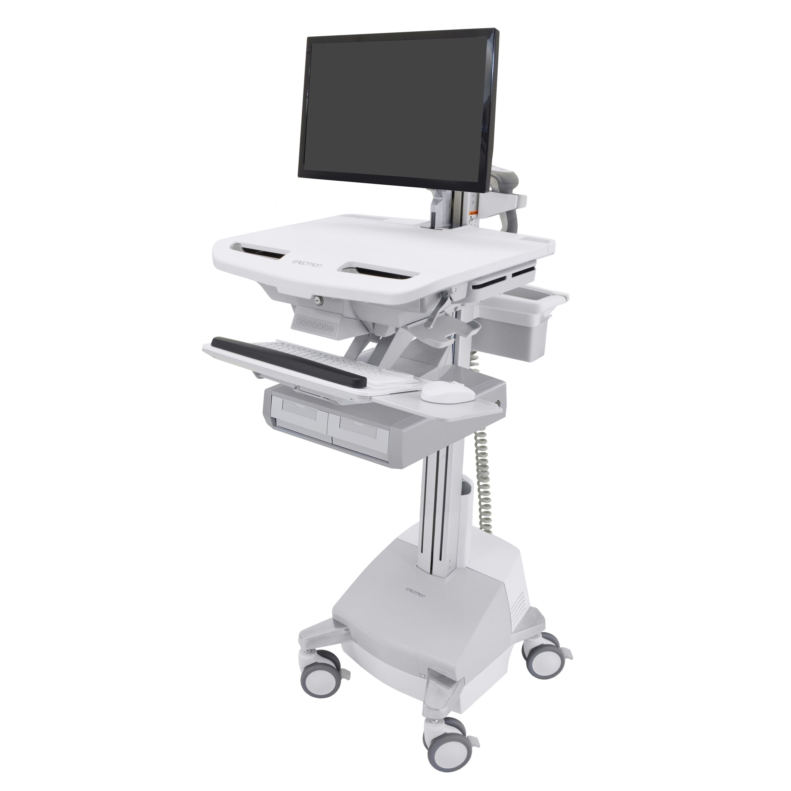 Stay productive and on the go with our certified power system. This innovative, truly ergonomic and easy-to-maneuver healthcare cart features sit-to-stand height adjustment, side-to-side LCD and keyboard motion, bi-focal viewing and an adjustable back-tilt keyboard tray. Its auto-locking drawer system enables simple and efficient management of non-controlled medication with variable-length PIN access for users.