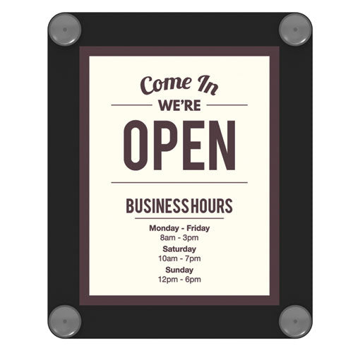 Double-sided display easily mounts to glass, and non-porous doors and walls with suction cups (included). Inserts simply slide in and out. Clear plastic protects and keeps message visible. For horizontal or vertical display. Heat-resistant/UV protected for long life. Create professional looking signs in seconds from your own office with deflecto®'s free online SignCreator™ software—no download required. Frame Color: Clear; Size: 10.88" x 0.06" x 13.31"; Message(s): Customizable; Insert Size: 8.5 x 11.