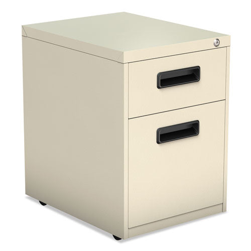 High-sided file drawer accommodates letter/legal filing. Counterweight prevents tipping. Visible easy-access casters, two locking. Steel ball bearing slide suspension with 3/4 extension on box drawers and full-length extension on file drawers. Full-length pull permits easy opening. Box drawers include one divider and pencil tray. Box/File, One 6" high box drawer and one 12" high file drawer. Color: Putty; Color Family: Beige; Overall Width: 14.96"; Overall Depth: 19.29".